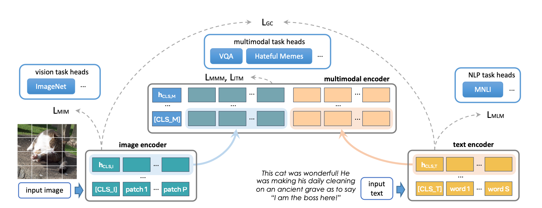FLAVA is a foundation multimodal model which consists of transformer based image and text encoders followed by a transformer-based multimodal fusion module. It is pretrained on both unimodal and multimodal data with a diverse set of losses. This includes masked language, image and multimodal modeling losses that require the model to reconstruct the original input from its context (self-supervised learning). It also uses image text matching loss over positive and negative examples of aligned image-text pairs as well as CLIP style contrastive loss. In addition to multimodal tasks (like image-text retrieval), FLAVA demonstrated competitive performance on unimodal benchmarks as well (GLUE tasks for NLP and image classification for vision).