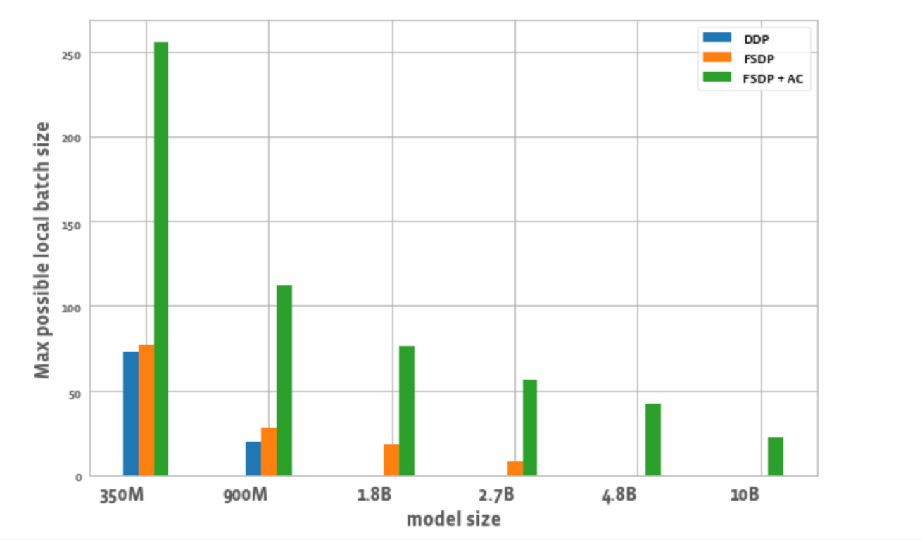- Batch size: FSDP alone enables slightly higher batch sizes compared to DDP. Using FSDP + AC enables ~3x batch size compared to DDP for the 350M param model and ~5.5x for 900M param model. Even for 10B, a max batch size of ~20 which is fairly decent. This essentially enables larger global batch size using fewer GPUs which is especially useful for contrastive learning tasks.