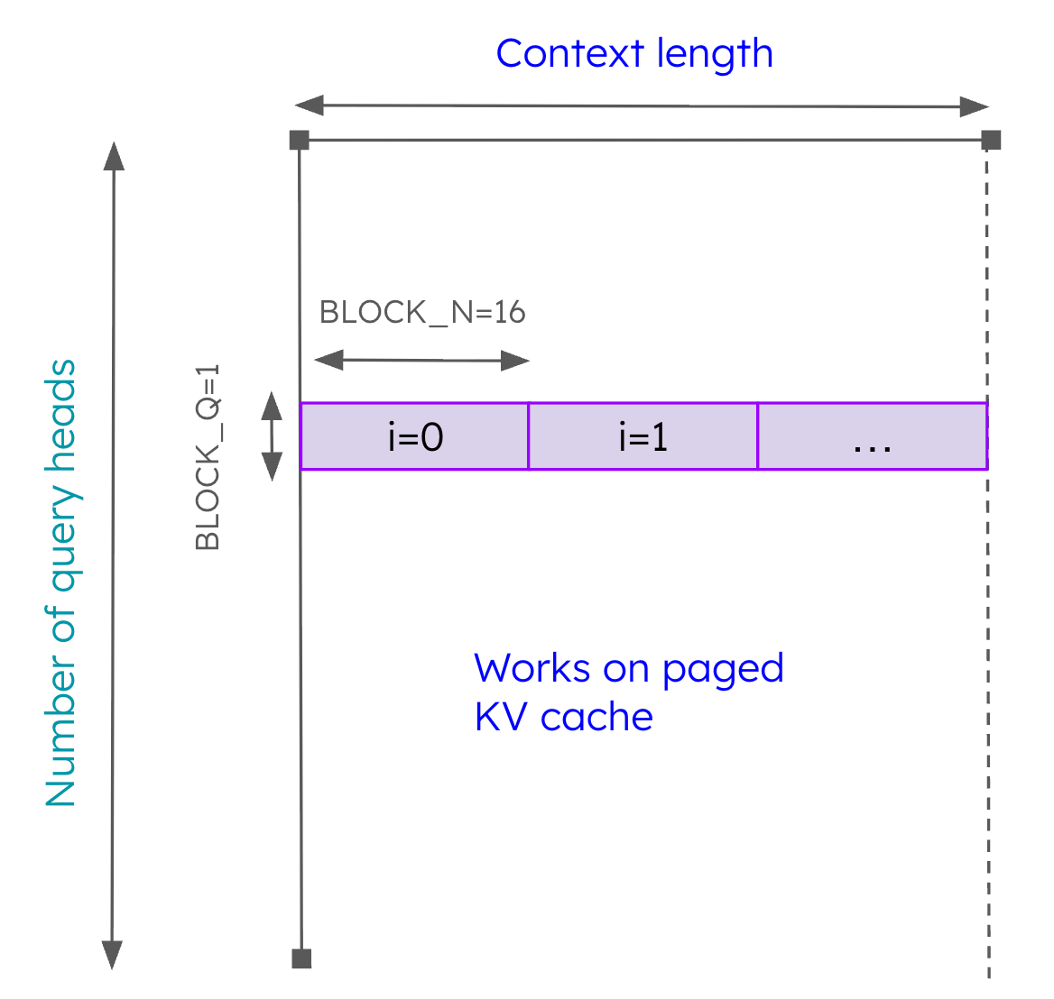 The work performed by this kernel is illustrated in Figure 5. Each program operates on a single query head (shown in the y-axis) and performs the tiled softmax along the context length dimension (shown in the x-axis). Since this kernel is working solely on paged KV cache, we set BLOCK_N=16 tokens to align with the default page size used in vLLM. Since there is no redundant “blocking” in the query dimension, we are not doing orders of magnitude more work that is necessary. Using this kernel in combination with prefix prefill led to around a 3.7x improvement in throughput.