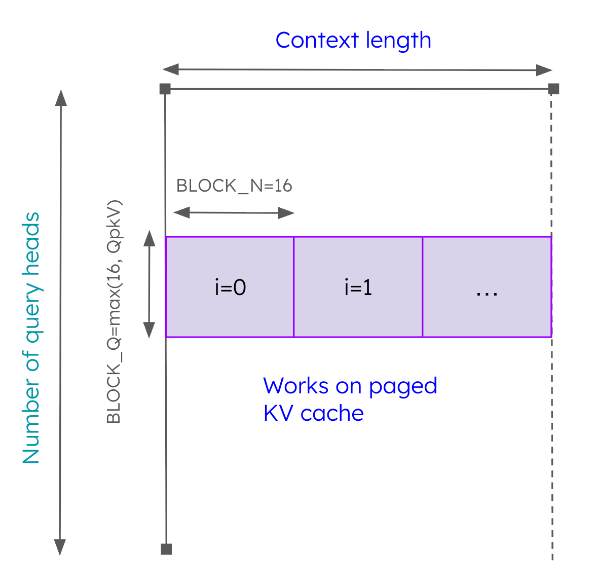Before we dive into describing how the kernels work, it is important to understand some basic terminology. When we talk about a sequence in vLLM there are three key quantities. Firstly, the context length denotes the number of tokens for which attention has already been computed and the key-value tensors are already stored in the paged KV cache. Secondly, the query length describes the number of “new” tokens that need to be computed in this scheduled iteration. Finally, the “sequence length” denotes the sum of the context length and the query length.