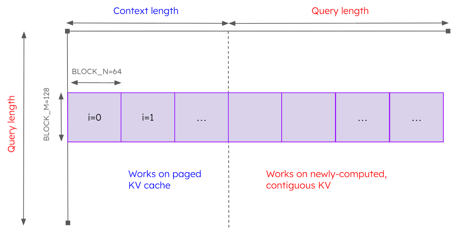 Initially, the only Triton kernel that existed that supported all of these scenarios was the prefix_prefill kernel. This kernel originated from the LightLLM project and provided a great way to get vLLM V1 up and running on AMD GPUs. As with all of the attention kernels described in this article, it implements the tiled softmax algorithm (specifically, the algorithm described in the FlashAttention-2 paper). When launching the kernel, we use a grid of size (batch_size, num_query_heads, query_length // BLOCK_M) where BLOCK_M is a constant set to 128. Thus, prefix prefill parallelizes the work across sequences in the batch, across query heads, and across “M blocks” in the query dimension. Each program is responsible for computing the tiled softmax along the sequence length dimension. Essentially, it iterates through the sequence length dimension in “tiles” where the size of the tiles in the sequence dimension is defined by BLOCK_N (a constant set to 64) and the size of the tiles in the query length dimension is defined by BLOCK_M. For the tiles that correspond to the context, the kernel reads the KV tensors from the paged KV cache. For the tiles that correspond to the query, the KV tensors are read from contiguous memory (since they have been computed in the same forward pass). The work performed by a given program is illustrated in Figure 3.