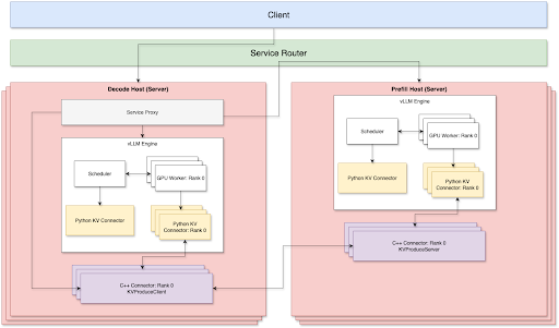 The service proxy is attached to the decode server. It forwards requests to a remote prefill host and orchestrates KV cache transfers between the decode and prefill KV connectors. We use Meta’s internal service router solution to do load balancing across all prefill hosts based on server workload and caching hit rate.