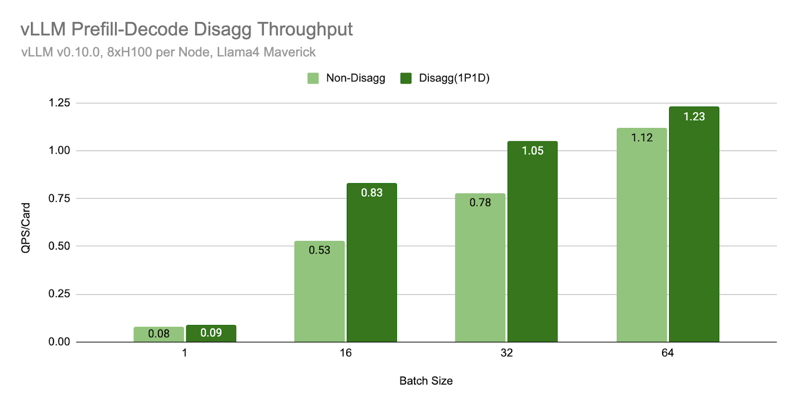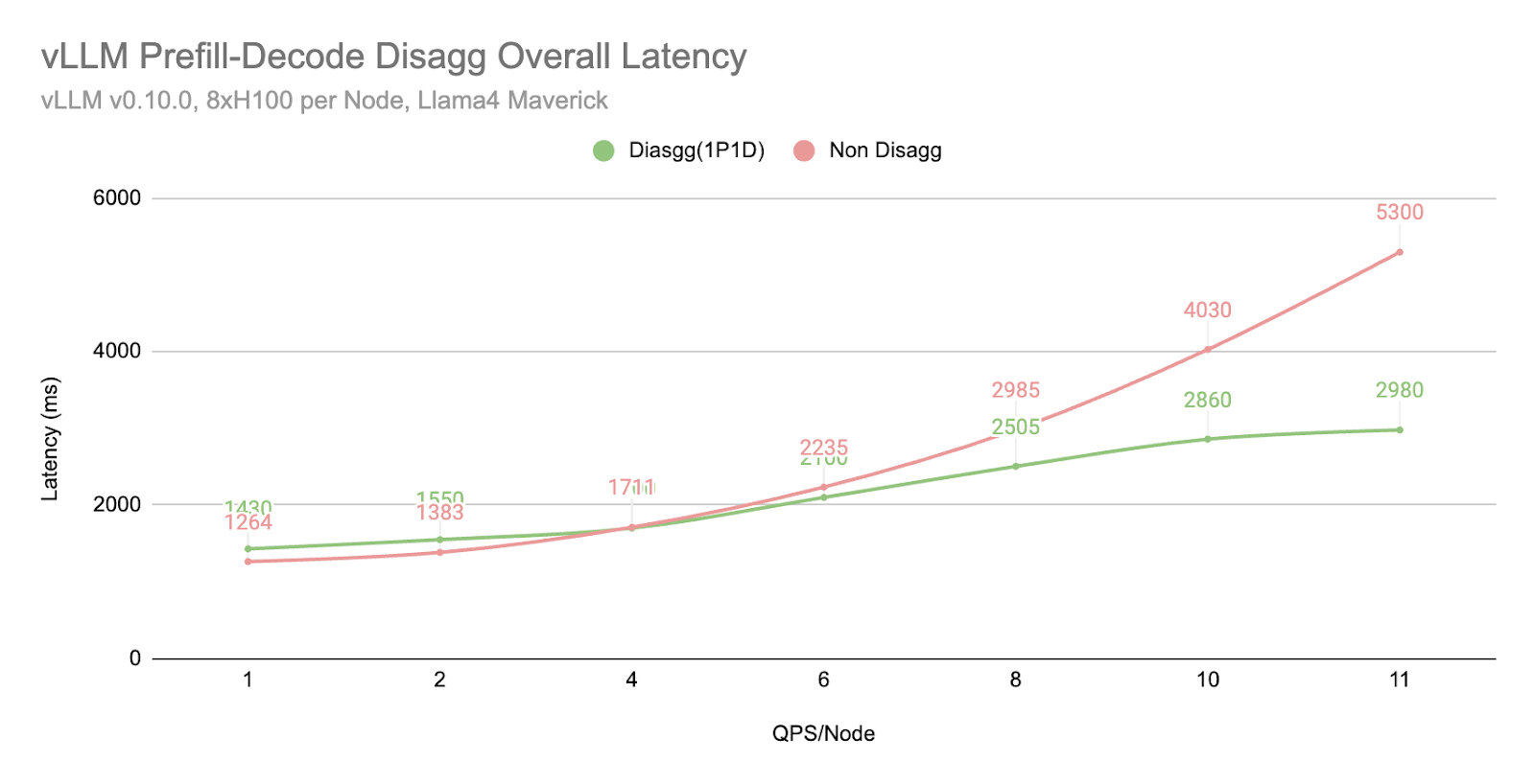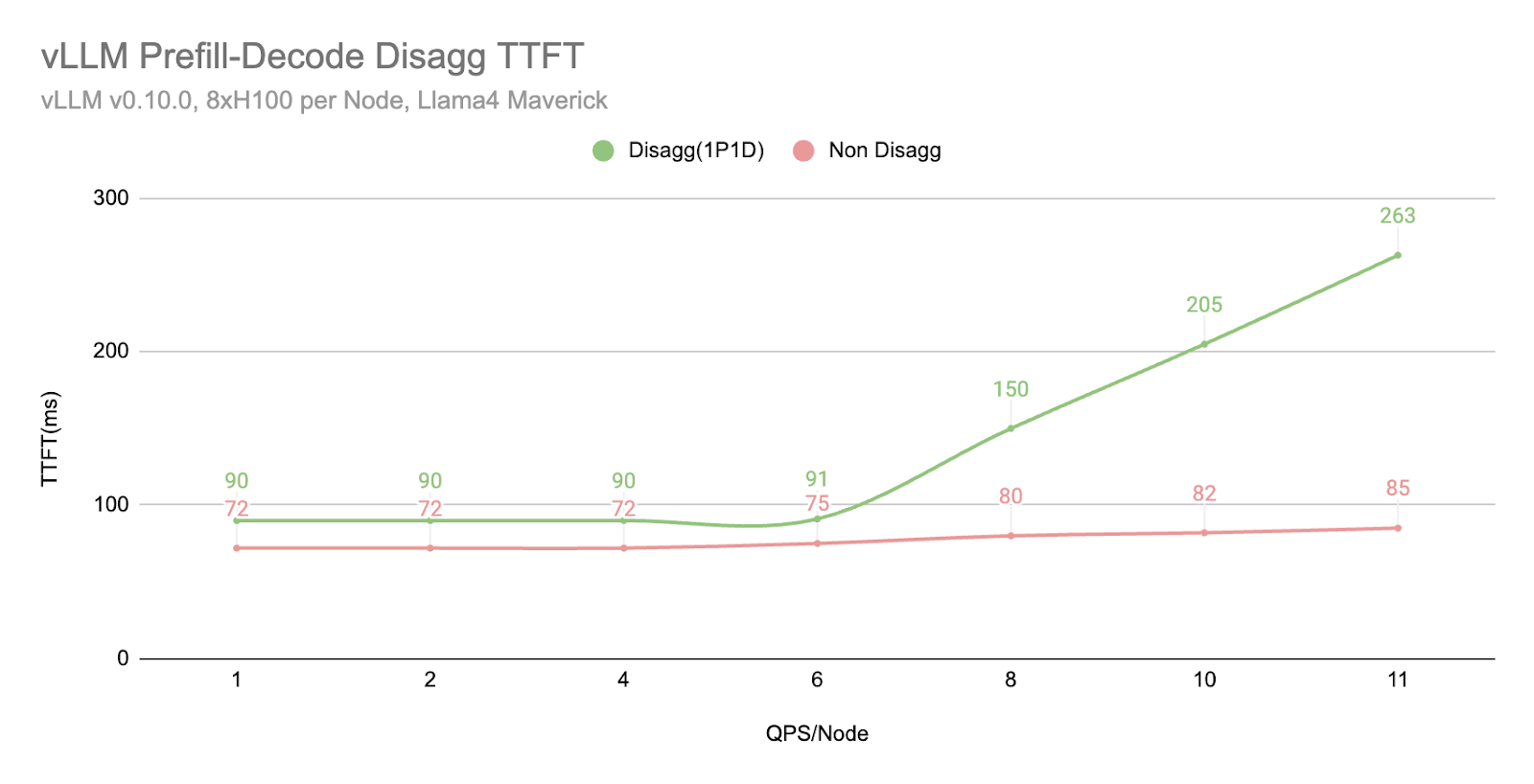 We benchmarked with Llama4 Maverick on H100 hosts (8xH100 card per host) connected by TCP network. The evaluation used an input length of 2000, an output length of 150.