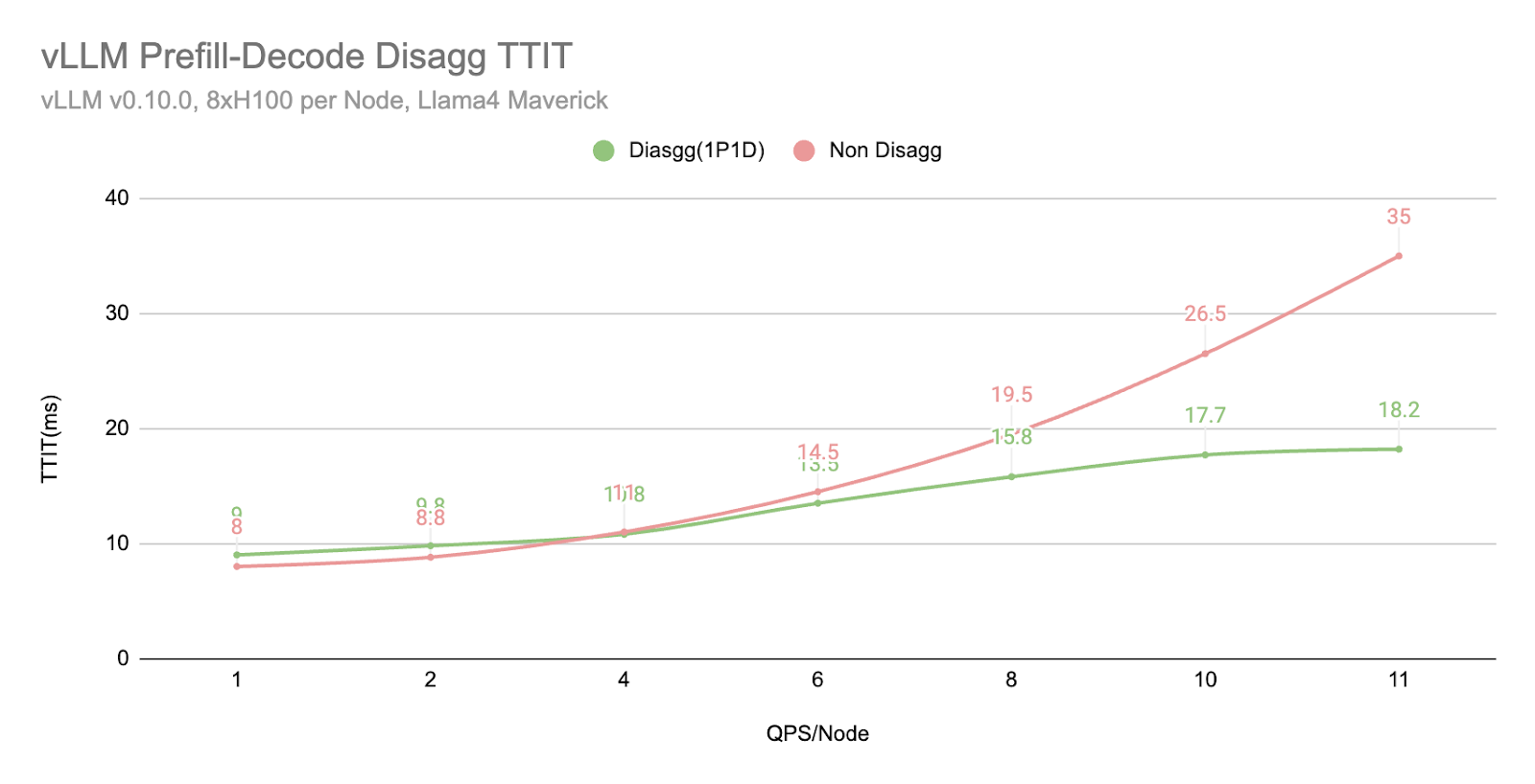 Under the same QPS workload, we identified disagg (1P1D) to provide better control for the overall latency due to the much smoother TTIT curve.