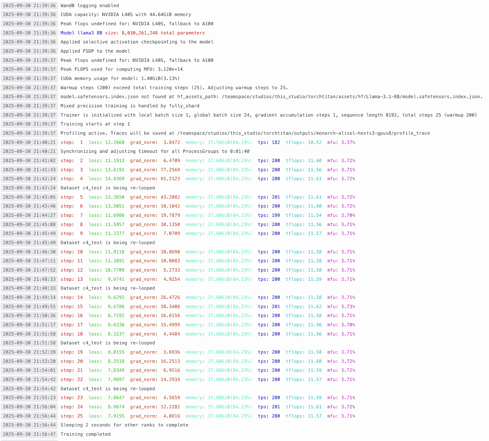 Users simply define the training configuration and initiate the trainer, triggering the Trainer Actor on the process mesh. Logs are reported on Rank_0 in the notebook cell, and are also accessible through the MMT logs, as well as LitLogger, the native logger on Lightning, or WandB, as Titan pushes logs to WandB.
