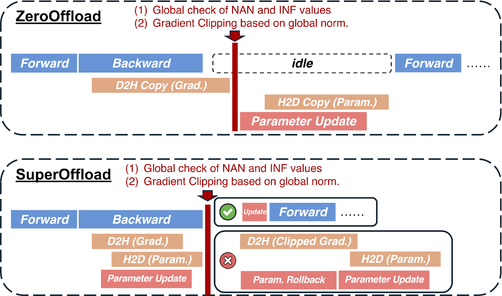 Figure 2: Previous offloading approach suffers from global gradient norm and global check of NAN and INF values, which expose the optimizer step to the critical path and prevent overlapping opportunities. In SuperOffload, we introduce a speculation-then-validation schedule to address this issue.