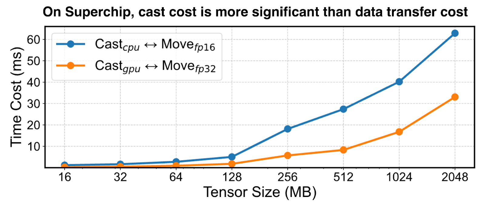 In mixed precision training with offloading, tensor transfers between GPU and CPU require casting between the low-precision format on GPU (e.g., BF16, FP16, etc.) and the high-precision format on CPU (i.e., FP32). To address the bandwidth limitations of PCIe interconnects, prior offloading solutions transfer tensors in low-precision and type cast tensors on both GPU and CPU as appropriate. However, this is a suboptimal strategy on Superchip architectures because GPU compute throughput is ~100X higher than CPU, and high-bandwidth interconnects (e.g., NVLink-C2C) makes the transfer costs negligible. As an illustration, Figure 4 below shows that the optimal strategy on GH200 is tensor casting on the GPU and transferring in high-precision format.