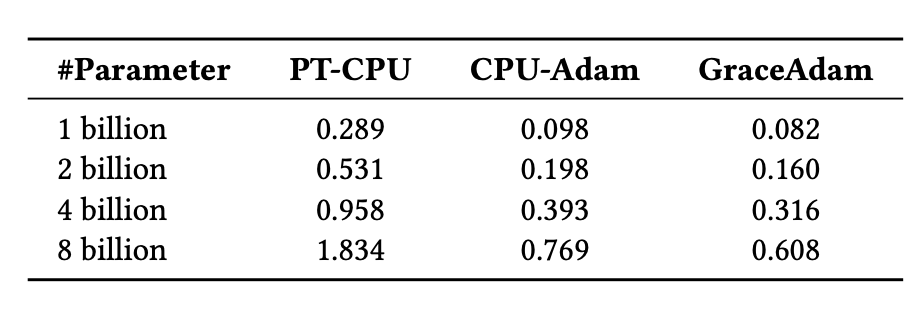 Existing offloading solutions for LLM training require CPU implementations of the popular Adam optimizer, such as PyTorch Adam and DeepSpeed CPU-Adam. However, these are inadequate for Superchips because they are not optimized for the Grace CPU architecture. To address this issue, we created GraceAdam, a highly efficient Adam optimizer implementation for Grace CPUs. GraceAdam achieves high performance exploiting the underlying ARM architecture features such as Scalable Vector Extension (SVE), explicit memory hierarchy management, and instruction-level parallelism. Figure 5 below shows that on GH200 Superchip, GraceAdam is 3X faster than PyTorch Adam (PT-CPU) and 1.3X faster than CPU-Adam. To our knowledge, GraceAdam is the first open sourced Adam optimizer implementation for Grace CPU.