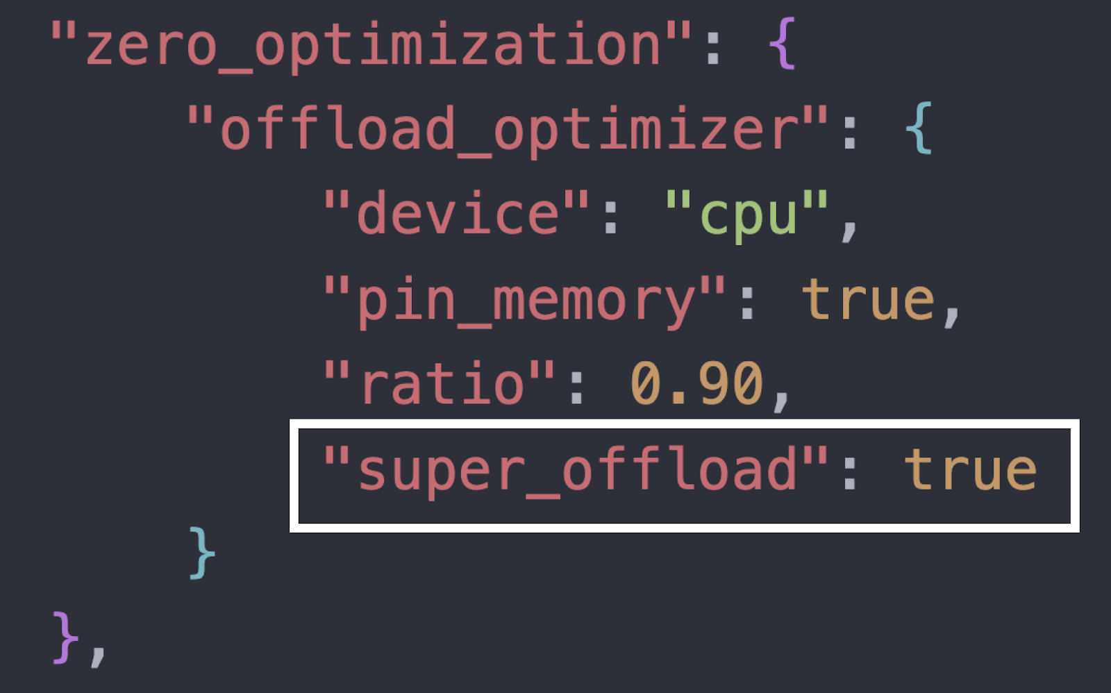 Figure 6: Enable SuperOffload with a single line in the DeepSpeed config.