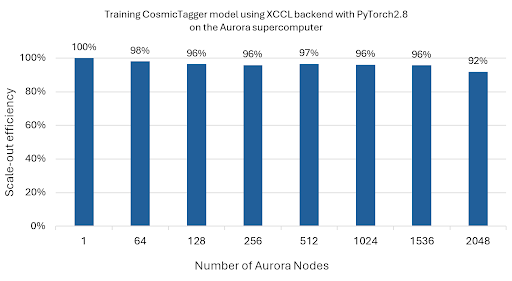 - The model achieved almost 92% scaling efficiency for scale-out (multiple devices across multiple nodes) distributed training up to 2,048 Aurora nodes (24,576 ranks) for FP32-precision weak-scaling runs (see Figure 1).