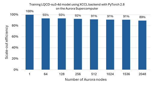 The LQCD-su3-4d model is used in high-fidelity physics simulations to solve the quantum chromodynamics (QCD) theory of quarks and gluons. We enabled the XCCL backend for this model with PyTorch’s DDP and successfully trained it on up to 2,048 Aurora nodes (24,576 ranks) for FP64 precision, achieving over 89% scale-out efficiency for weak-scaling runs (see Figure 2).