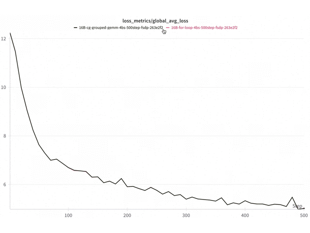 Figure 9. Loss curve comparison Triton vs for-loop 16B DeepSeekv3 on 8x NVIDIA H100 with FSDP2