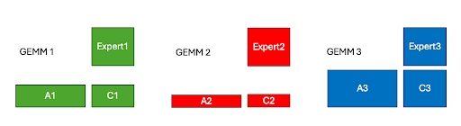 To illustrate this, we can imagine a toy scenario where we have 3 expert weights and a varying number of tokens being routed to each expert, so the activations are of different sizes. We can construct these 3 matrix multiplications of varying sizes into a single Grouped GEMM problem, which allows us to calculate the output matrices C1, C2, and C3 in a single kernel launch.