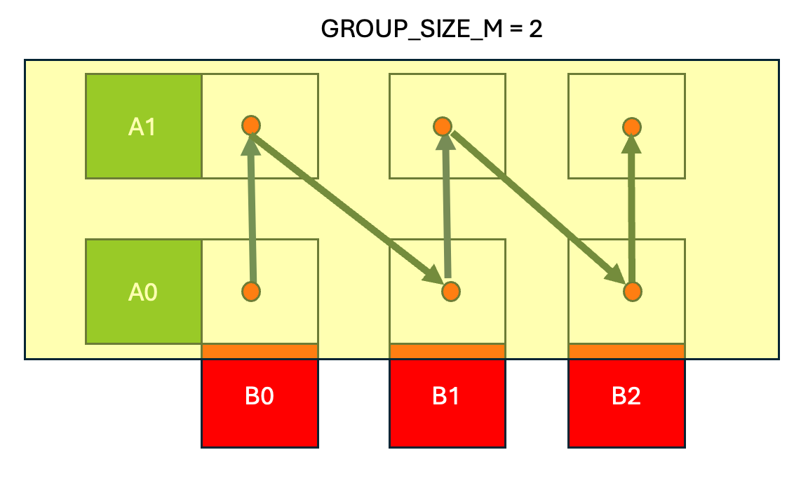 In the grouped launch schedule we hold a band of rows (=2) in Figure 3, from the A matrix in cache and traverse column-major across the output C matrix computing C(0,0) -> C(1,0) ->…-> C(GROUP_SIZE_M, 0) before moving to the next column and computing C(0,1) -> C(1,1) etc.