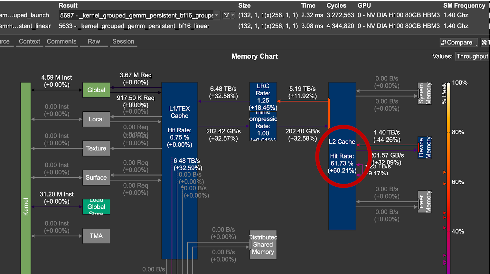 For the problem sizes we tested, the group launch ordering proved more performant in terms of date reuse and latency. From the above figure 4, we note a 1.33x speedup and a +60% in L2 Cache Hit Rate with the optimized schedule.