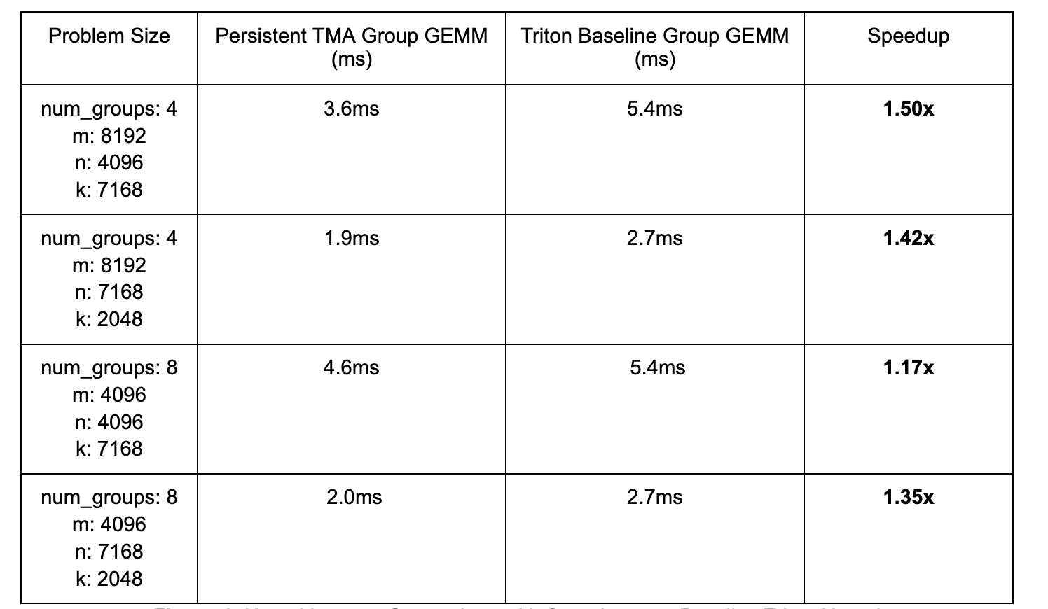 We benchmarked our Hopper-optimized kernel against a baseline Triton Group GEMM kernel that does not contain the optimizations we discussed to isolate the gain from these techniques.