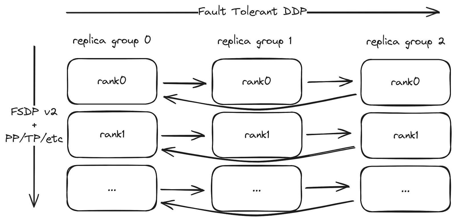 - Fault Tolerant HSDP: An extension of FSDPv2 that uses a fault tolerant all-reduce. This exactly emulates standard HSDP training with per step all_reduce of the gradients and per step fault tolerance. This works best for large scale training with fast backend networks such as infiniband.