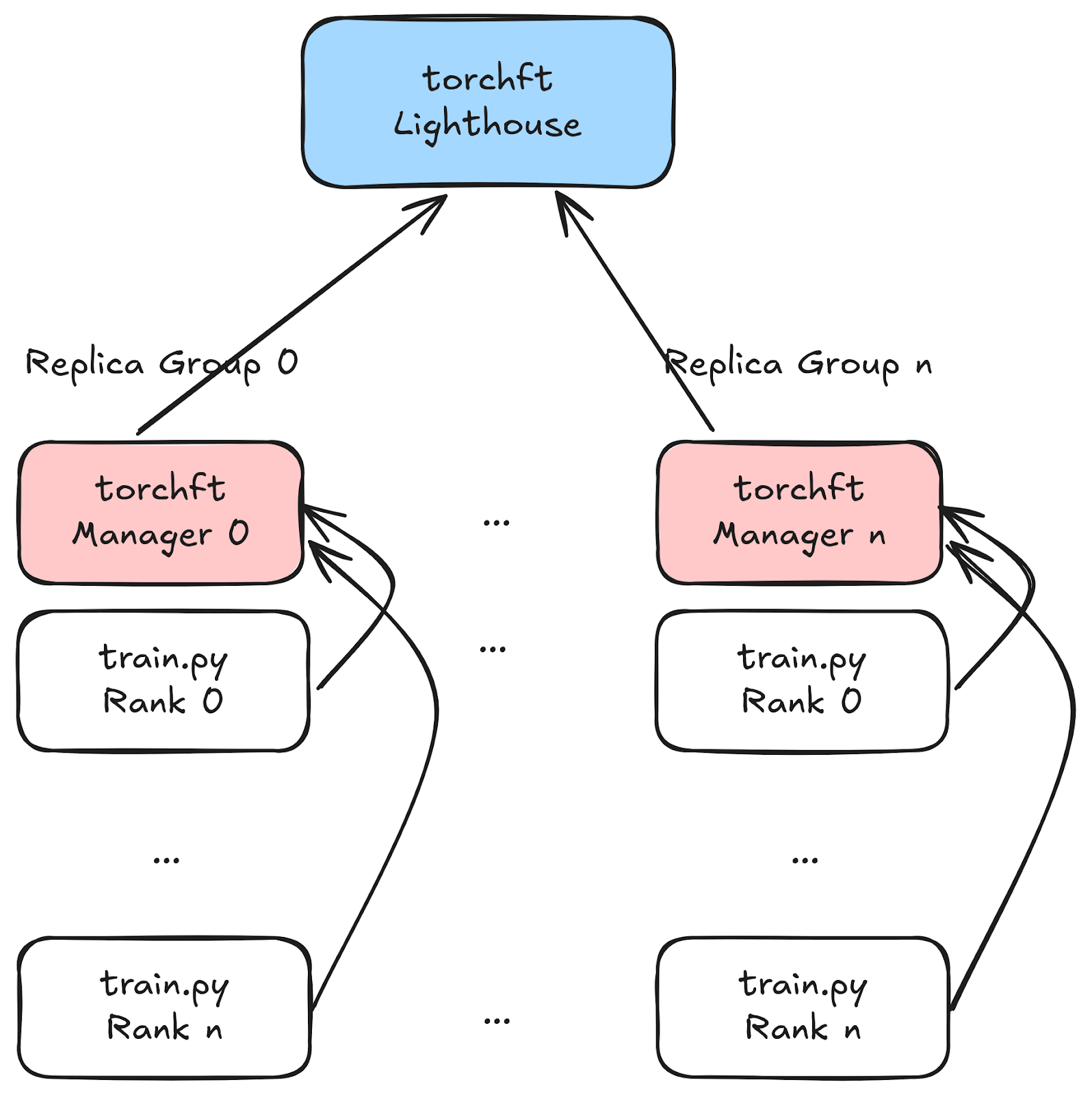 torchft uses a global Lighthouse server and per replica group Managers to do the real time coordination of workers. The Lighthouse knows the state of all workers and which ones are healthy via heartbeats.