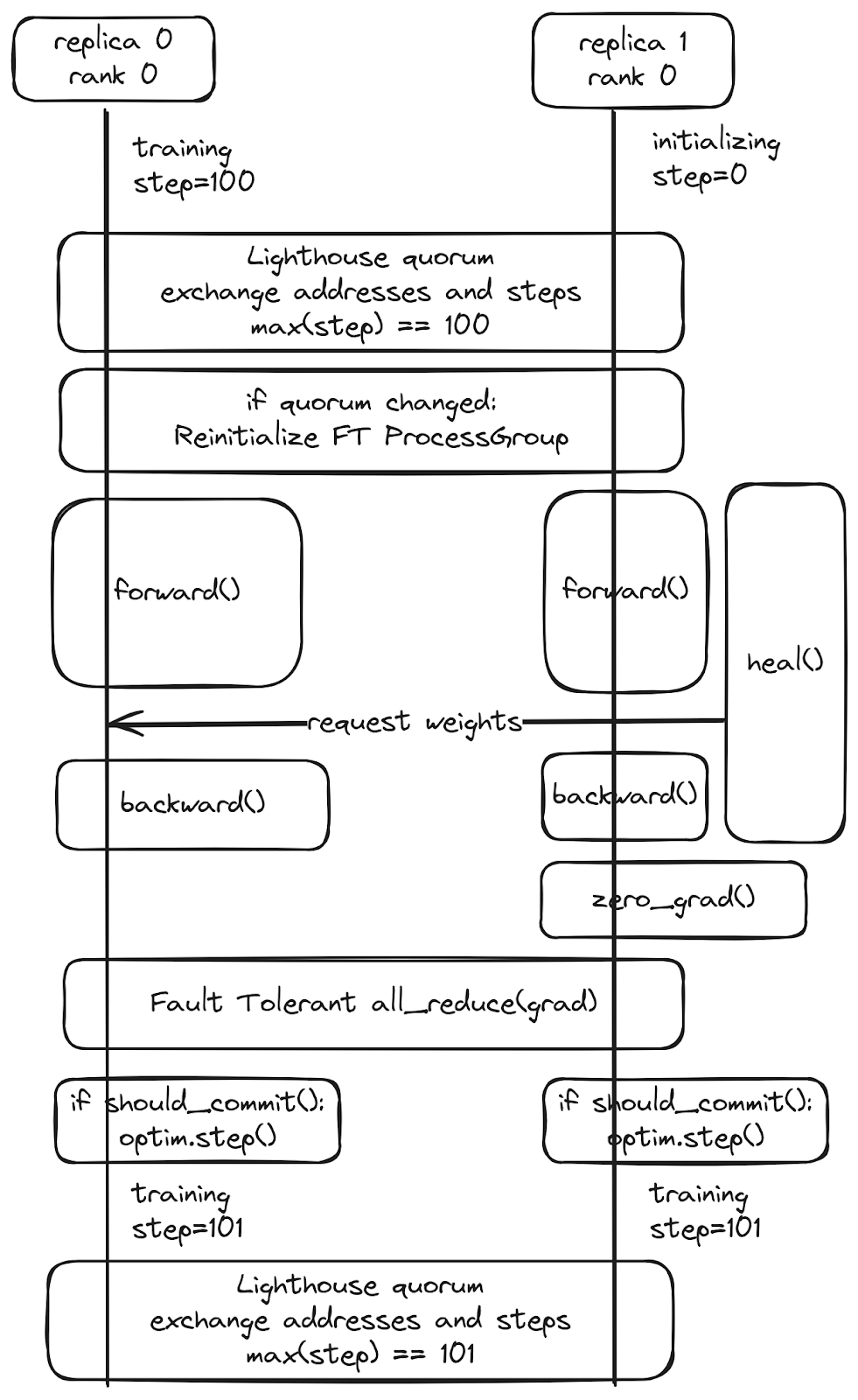 Here’s a diagram showing how a recovering replica (replica 1) can join the quorum and recover from a healthy peer (replica 0) without having any downtime or impacting the healthy worker training: