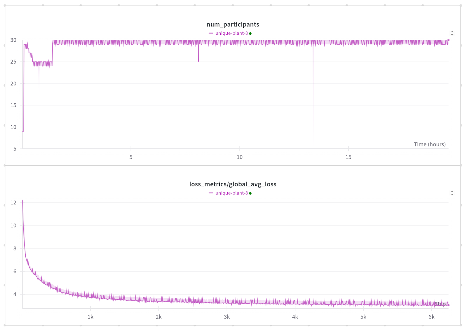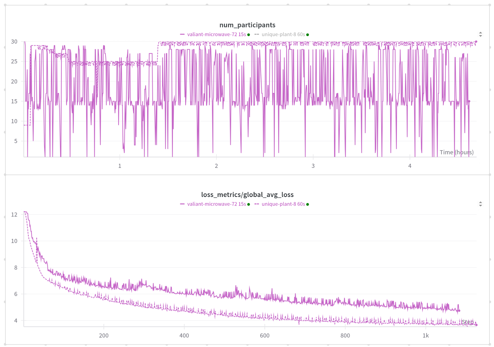 We do see some bigger spikes in the loss, which are correlated with times when only 1 participant is healthy and thus has 1/30th the batch size. This is easily avoided by adjusting the minimum number of replicas. We had it set to 1 for this test.