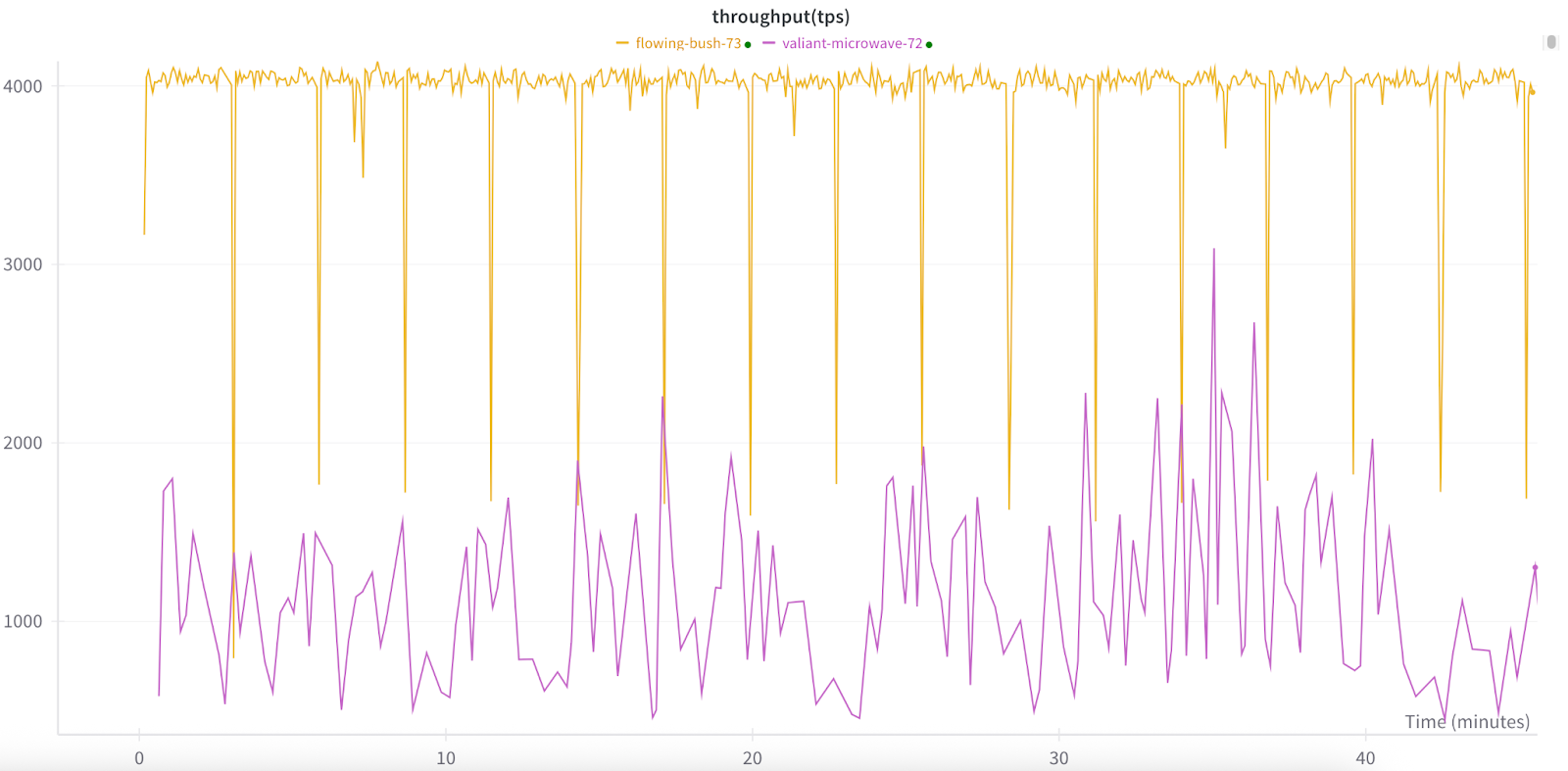 TorchFT also supports semi-synchronous training algorithms, including LocalSGD and DiLoCo, with plans to add more in the future. Unlike HSDP2, these algorithms do not synchronize at every step. Instead, they perform local training for several steps before synchronizing weights through averaging parameters or gradients. This approach enhances performance by reducing communication costs to once every N steps (a configurable hyperparameter), rather than at every step. Our tests on the cluster demonstrate a noticeable improvement in throughput. When synchronizing every 40 steps, we minimize the communication overhead, resulting in higher overall throughput. Below is a comparison of DiLoCo’s throughput (yellow), averaging around 4000 tps, compared with that of regular HSDP2 (purple), which averages around 1200 tps.