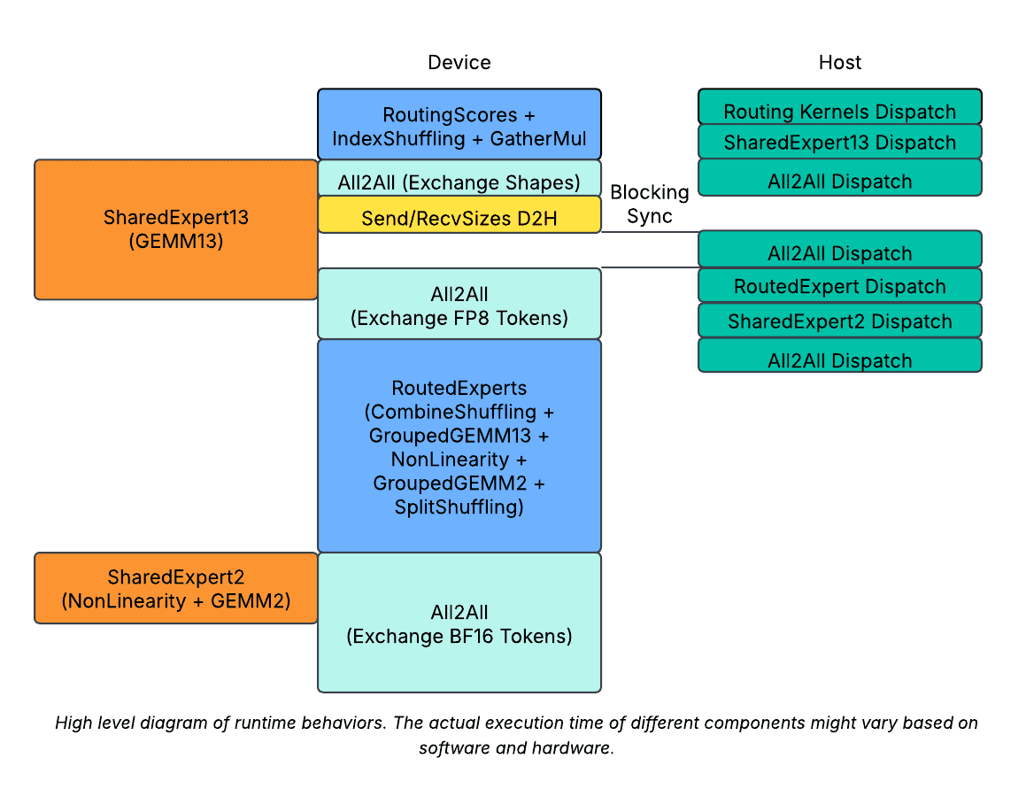 - We had the first part dispatched right after routing, but before dispatch A2As. Then, when the device/host synchronization happens, the device is still kept busy running shared experts.