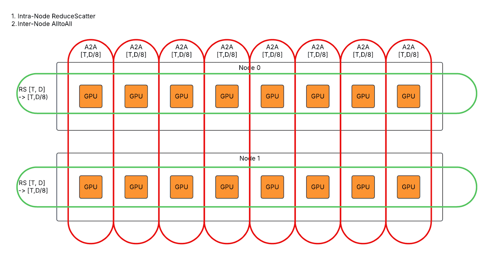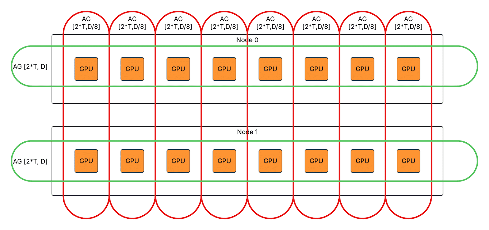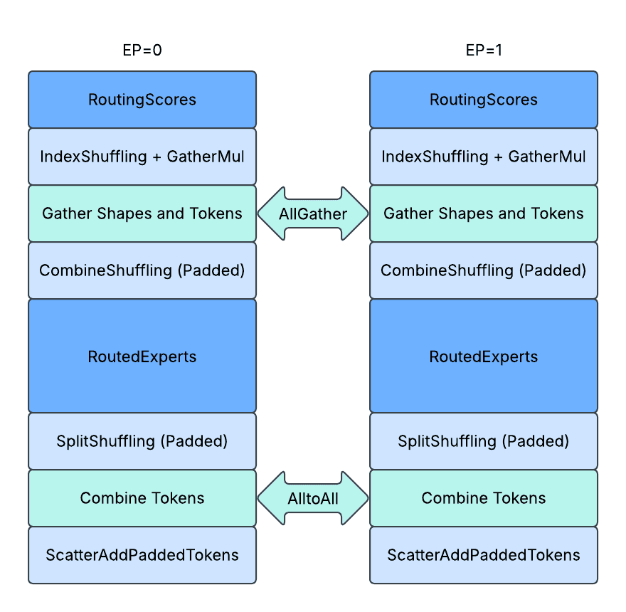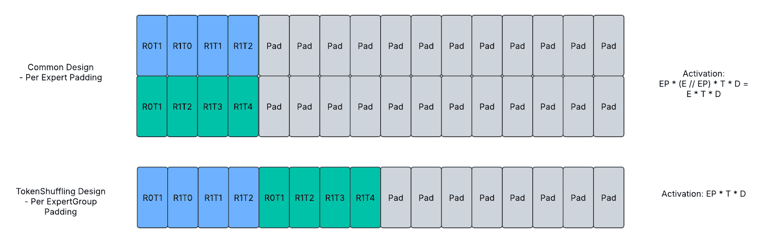 To achieve the minimal required padding, we directly use AllGather to gather all active tokens from different EP ranks and then splits and reshuffles routed tokens locally through custom kernels. The activation size is compressed to 1 / (E // EP), which corresponds to reductions in memory and network traffic.