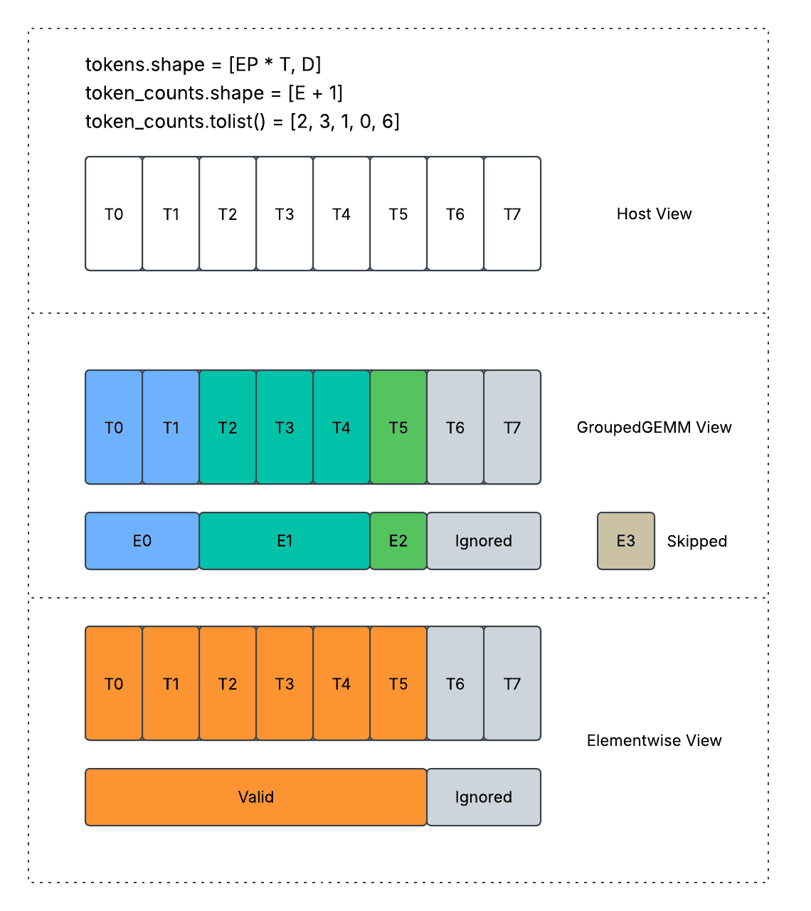 - Input: reshuffuled_tokens: [T*, D] (first ordered by expert indices, then ordered by dp ranks); routed_token_counts_per_rank_per_expert: [EP, E // EP];