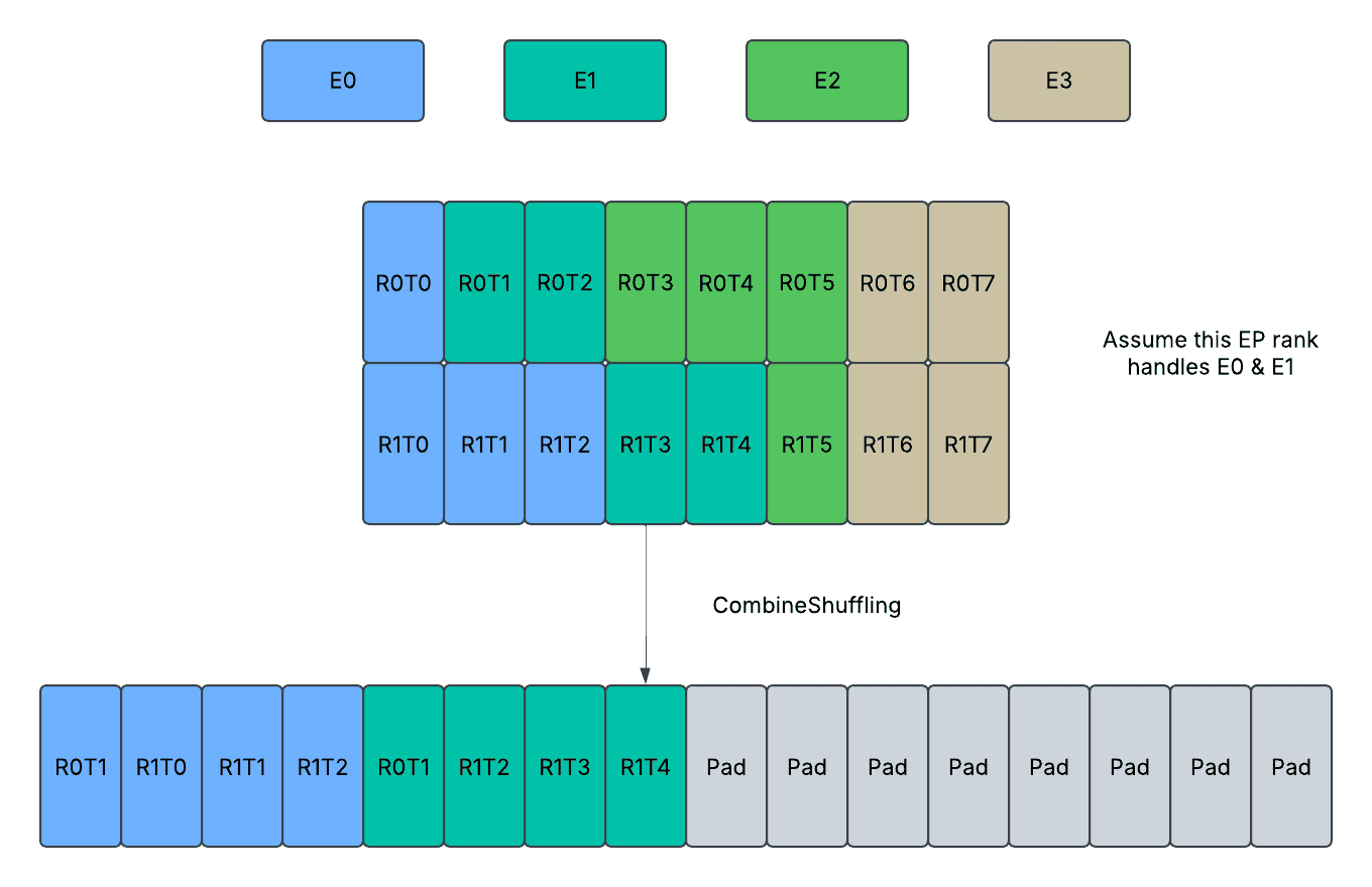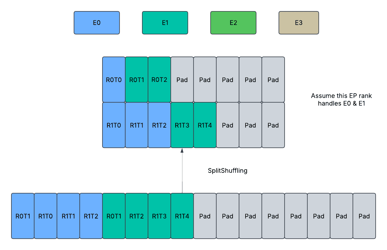 - SplitShuffling (Dense or Padded): Reverse process of CombineShuffling. Reshuffles to-send tokens from expert first order to rank first order.