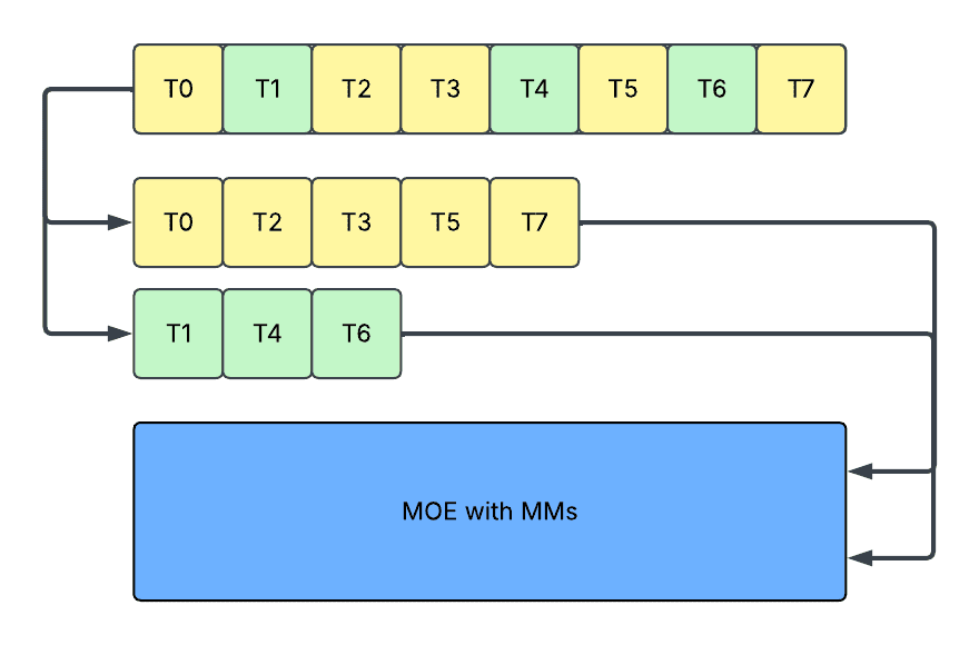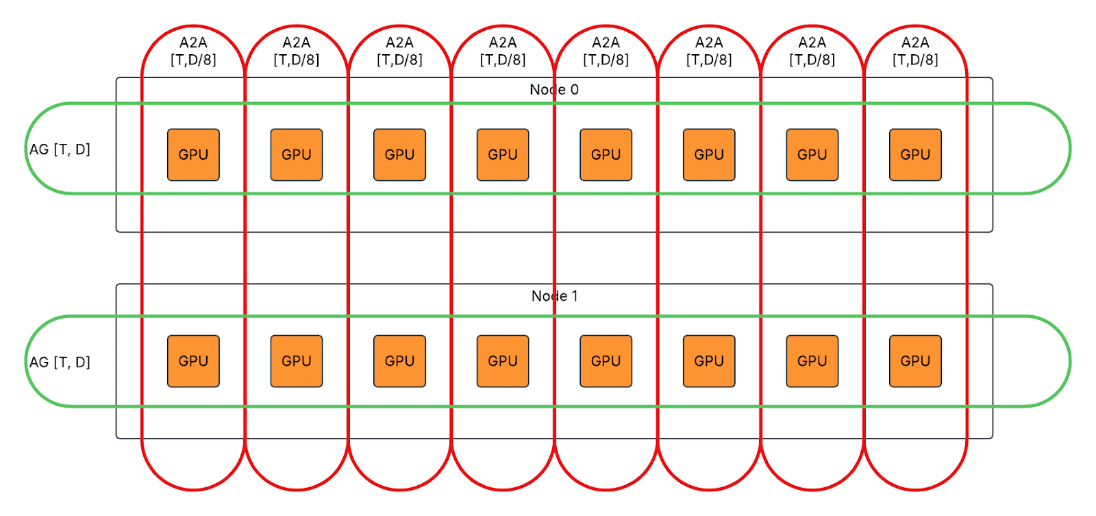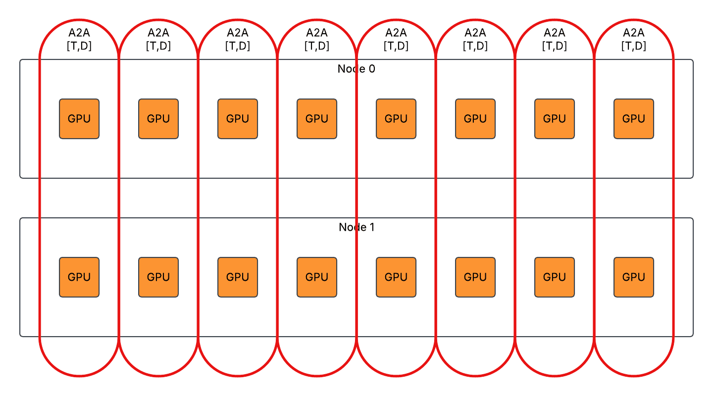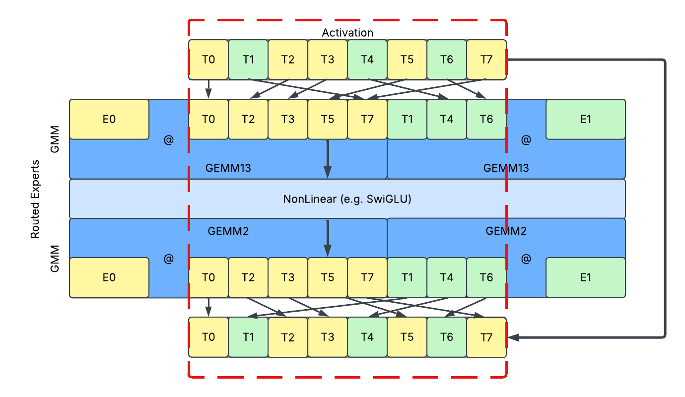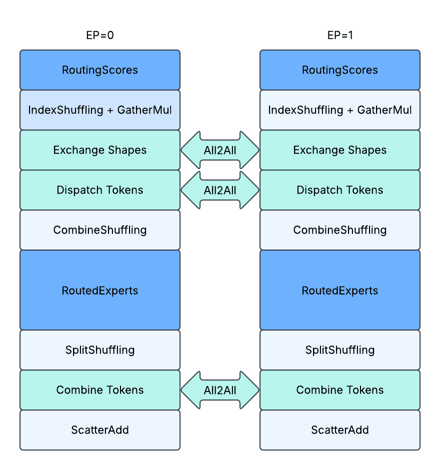 - 2nd A2A: Exchange tokens from data parallelism based to expert parallelism based, dispatching to different EP ranks based on routing.