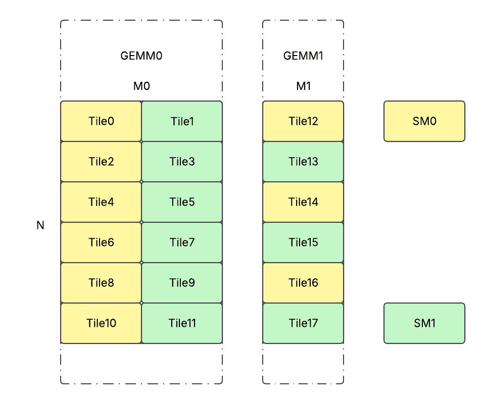 - GroupedGEMM: An optimized GroupedGEMM kernel that handles on-device shape information about batches along M dimension without restrictions. We will introduce an optimized implementation in the Kernel Design section.