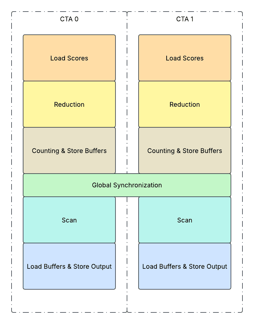 - It performs an `atomicAdd` operation on the global counter on HBM. Afterwards, all CTAs will wait until the global counter reaches the number of total tokens, with a `st.release` + `ld.aquire` barrier guarding preceding store operations and following load operations to ensure correctness.