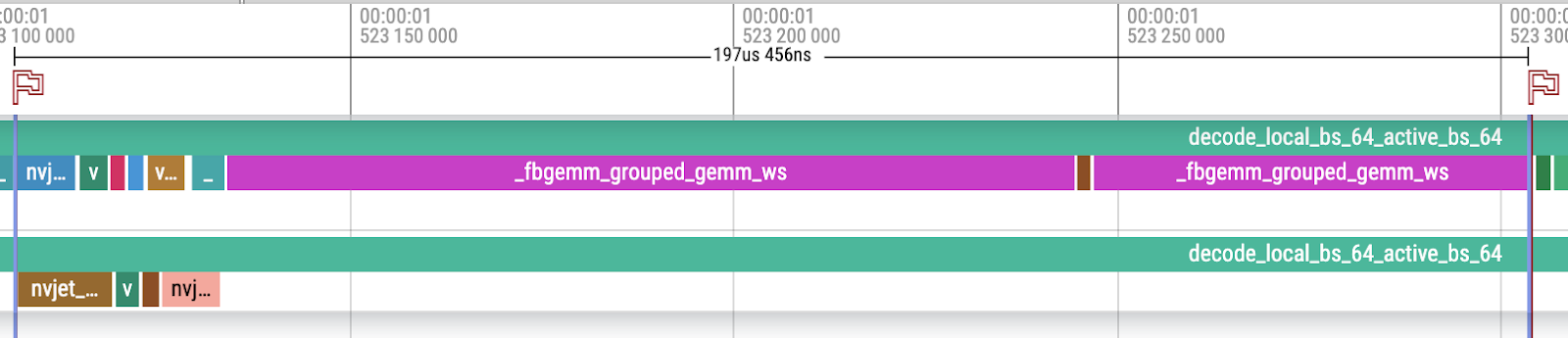 Here is an example decoding trace of Llama 4 Scout BF16 with 64 tokens using our MetaShuffling MoE inference solution.
