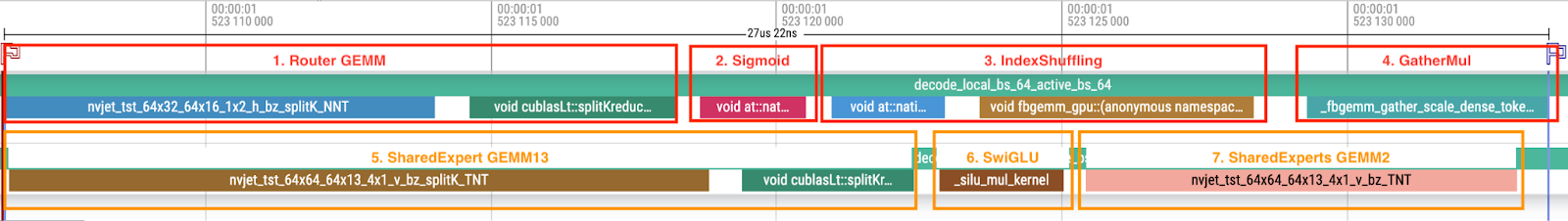 First is the breakdown of routing and shared experts. Both components are running concurrently on 2 different streams to achieve better resource utilization.