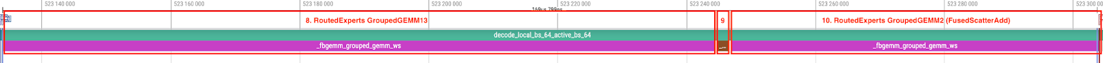 - 10. RoutedExperts GroupedGEMM2: FBGEMM-based GroupedGEMM with a persistent kernel design, fused with scatter add in the epilogue.