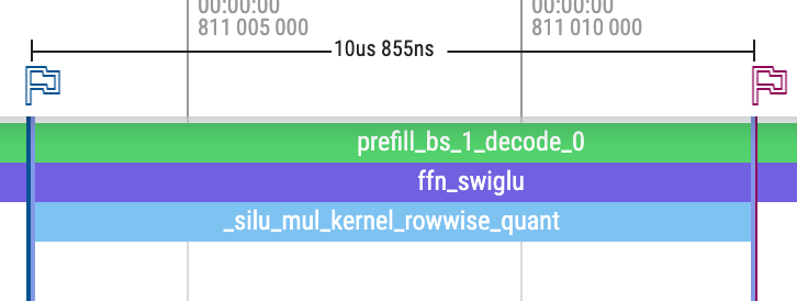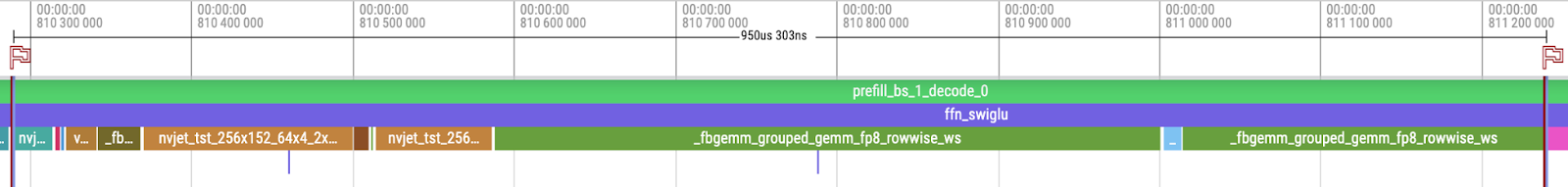 Here is an example prefill trace of Llama 4 Maverick FP8 with 5000 tokens using our MetaShuffling MoE inference solution. Note FP8 rowwise scaling for routed experts, and BF16 for router and shared experts.
