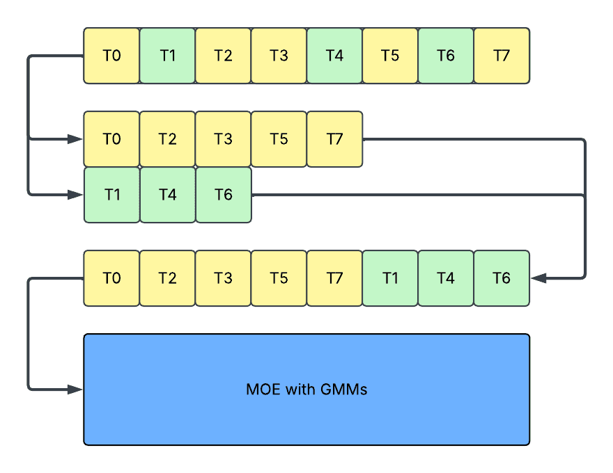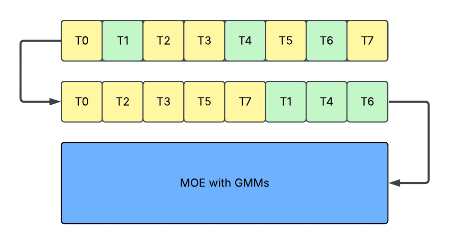 - Shuffling: In this approach, we directly sort the tokens so that routed tokens are ordered by routed expert’s ID. By doing so, no padding or splitting is introduced, and tokens assigned to the same experts are stored together and can be processed together inside GroupedGEMM. It provides a dense model interface and avoids all the problems mentioned above.