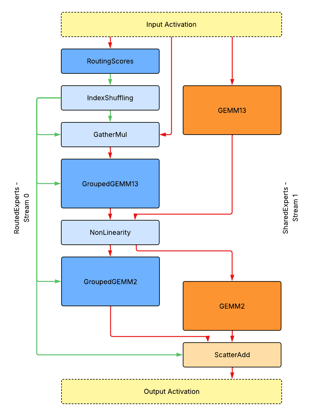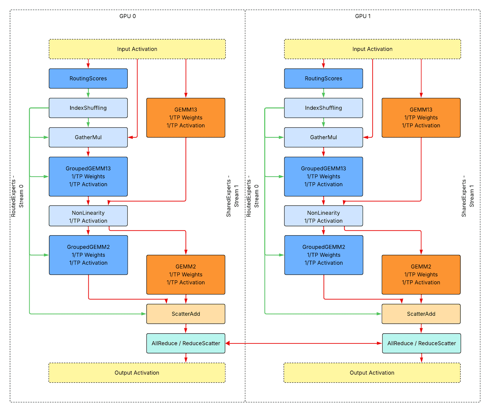 - It uses a single stream to avoid interactions of kernels between router and shared experts. As the kernels are working on a large enough problem size that can saturate compute resources, having additional overlapping simply causes contentions, especially on L2 cache.
