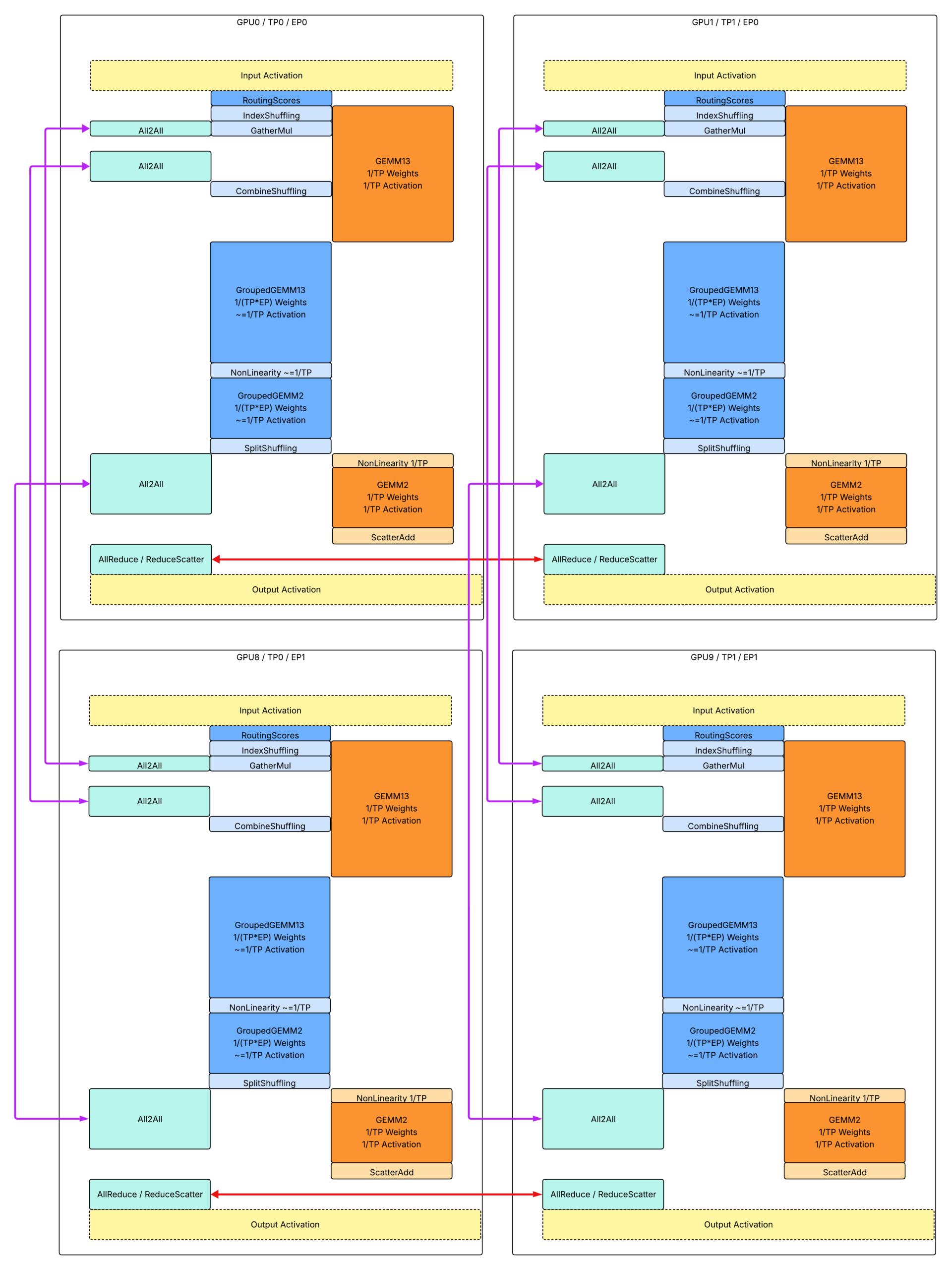 - 3rd A2A: Exchange tokens from expert parallelism based to data parallelism based, combining from different EP ranks based on routing.
