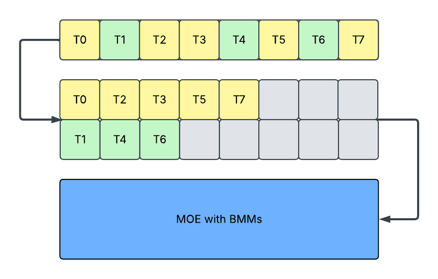 The above diagram shows the padding design. Each box represents a token, and the yellow / green color represents valid tokens with different routed experts, and the grey color represents padded tokens. Each row of boxes in the second step represents different routed experts. Ti represents the i-th token from the current rank of the data parallel group.