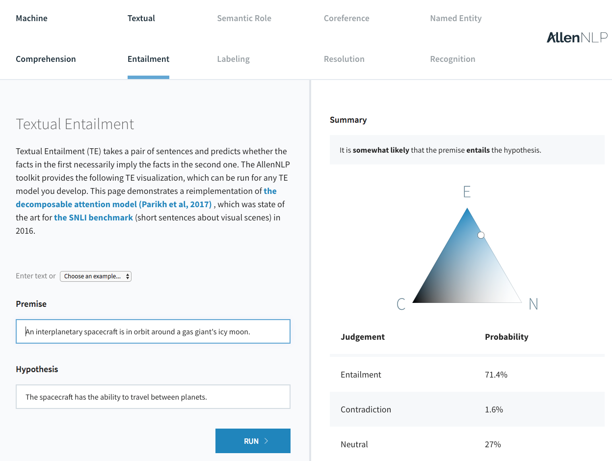 The Allen Institute for AI released AllenNLP which includes several state-of-the-art models in NLP — reference implementations and easy to use web demos for standard NLP tasks.