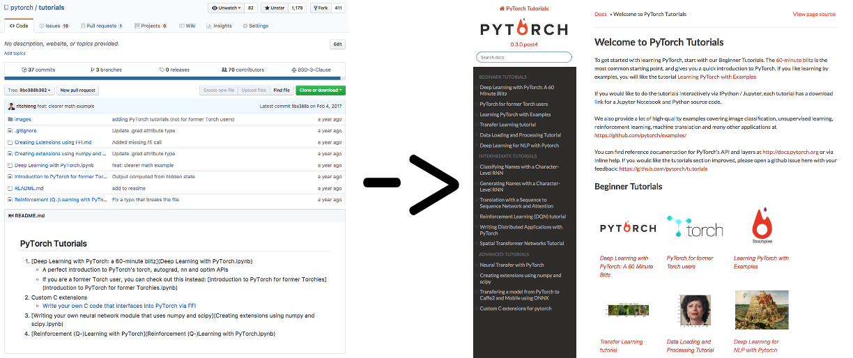 Sean Robertson and Justin Johnson wrote great new tutorials — in NLP, and to learn by example. Yunjey Choi wrote a beautiful tutorial where most models were implemented in 30 lines or less. Each new tutorial helped users find their way faster, with different approaches to learning.