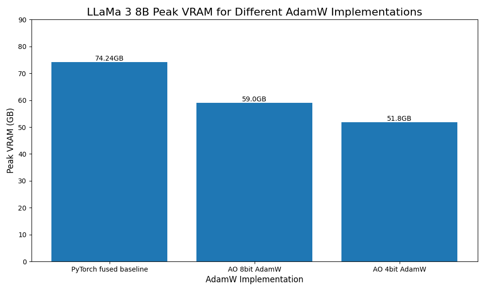 - 30% peak VRAM reduction for Llama 3 8B using 4 bit quantized optimizers.