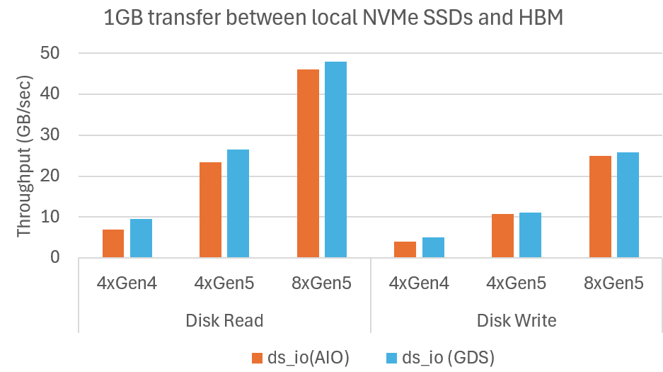 We introduced DeepNVMe in summer 2024 as a suite of optimizations for tackling I/O bottlenecks in Deep Learning (DL). DeepNVMe delivers significant speedups for I/O bound DL workloads by leveraging storage innovations including local NVMe SSDs, NVIDIA Magnum IOTM GPUDirect® Storage (GDS), and Linux Asynchronous I/O (AIO). In this update, we are delighted to announce DeepNVMe improvements on multiple fronts: (i) expanding application coverage to FastPersist model checkpointing and SGLang inference, (ii) I/O performance scaling by upgrading from PCIe Gen4 to Gen5 NVMe SSDs, and (iii) expanding usability to CPU-only environments, offset-based I/O operations, and tensor data type casting. The results reported in this blog are available in DeepSpeed versions >= 0.17.1.