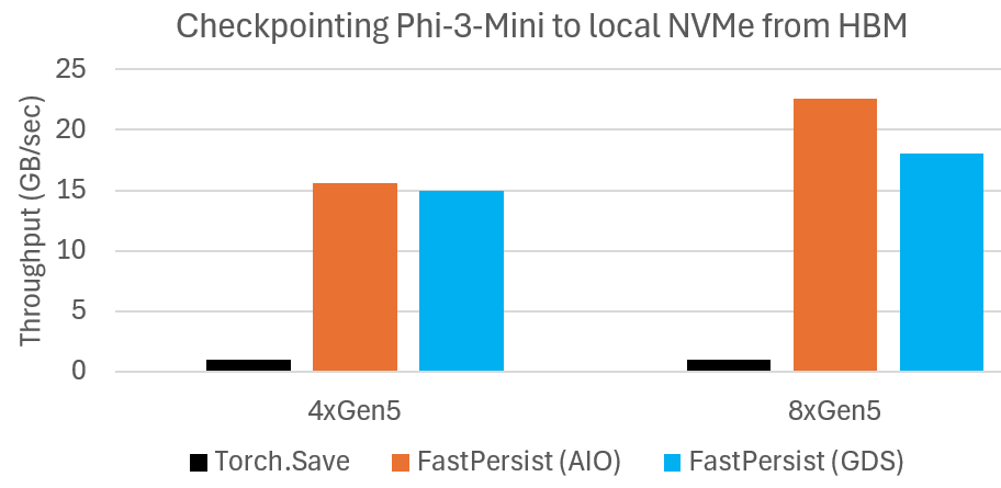 We measure the throughput of serializing Phi-3-Mini checkpoint state from HBM to local NVMe storage. The results are summarized in the Figure below. We observe significantly faster checkpointing with FastPersist compared to the baseline. We see speedups of over 20X in the 8xGen5 NVMe settings. We also observe FastPersist scaling with increased NVMe bandwidth of 8xGen5 compared with 4xGen5.