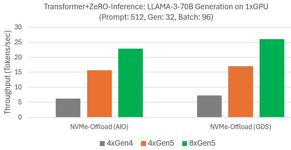 ZeRO-Inference enhances HF Transformer inference with efficient model offloading to DRAM or NVMe. We previously evaluated LLAMA-3-70B generation performance with NVMe offloading on a single GPU and four Gen4 NVMes in an Azure NC_A100_v4 VM. We measured the generation speed for a prompt of 512 tokens, output of 32 tokens, and batch size 96. Since NVMe bandwidth was the main bottleneck, we repeat the experiments on Azure ND-H200-v5 offering Gen5 NVMes. The results summarized in the Figure below show that ZeRO-Inference uses the increased NVMe bandwidths to improve generation speeds. For example, with GDS, generation speed improves from 7 tokens/sec with four Gen4 NVMes to 17 tokens/sec with four Gen5 NVMes, and further to 26 tokens/sec with eight Gen5 NVMes. We observe similar improvements without GDS. These results show that ZeRO-Inference performance can be improved in cost-effective manner by increasing NVMe bandwidths.