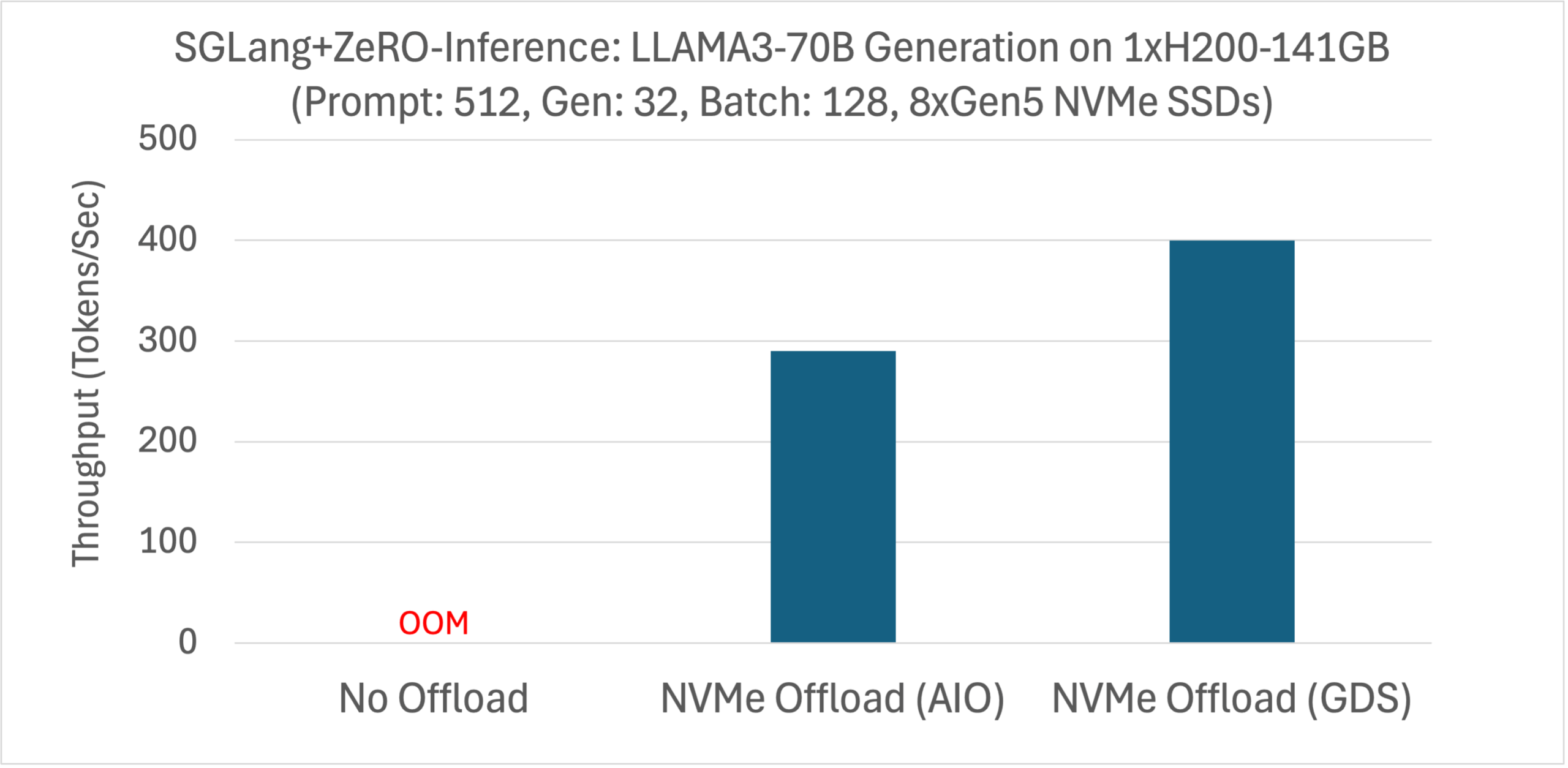 SGLang is a state-of-the-art serving framework for large language models (LLMs) and vision language models (VLMs). Our integration of ZeRO-Inference into SGLang makes SGLang available to budget-constrained users, and offers a cost-reduction option to existing SGLang users. We used SGLang’s offline benchmarking tool to measure the generation throughput of LLAMA3-70B on a single H200 with NVMe offloading (LLAMA3-70B cannot fit in the 141GB VRAM without offloading). The experiment is configured with prompt length of 512, generation length of 32, and batch size of 128. We summarize the results in the figure below for both AIO and GDS offloading.