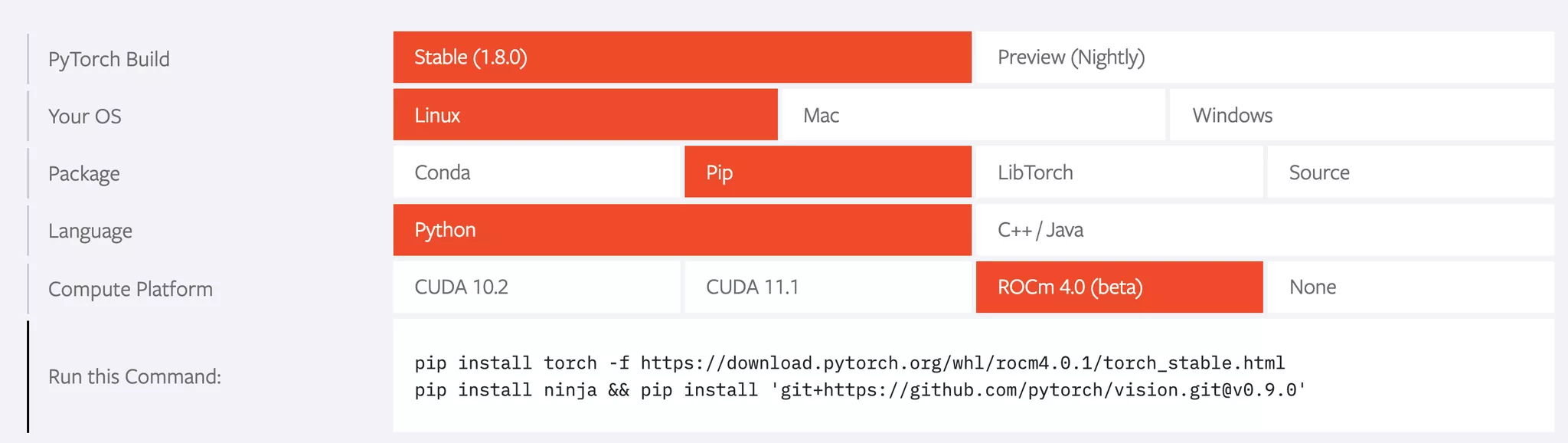 The scope for this build of PyTorch is AMD GPUs with ROCm support, running on Linux. The GPUs supported by ROCm include all of AMD’s Instinct family of compute-focused data center GPUs, along with some other select GPUs. A current list of supported GPUs can be found in the ROCm Github repository. After confirming that the target system includes supported GPUs and the current 4.0.1 release of ROCm, installation of PyTorch follows the same simple Pip-based installation as any other Python package. As with PyTorch builds for other platforms, the configurator at https://pytorch.org/get-started/locally/ provides the specific command line to be run.