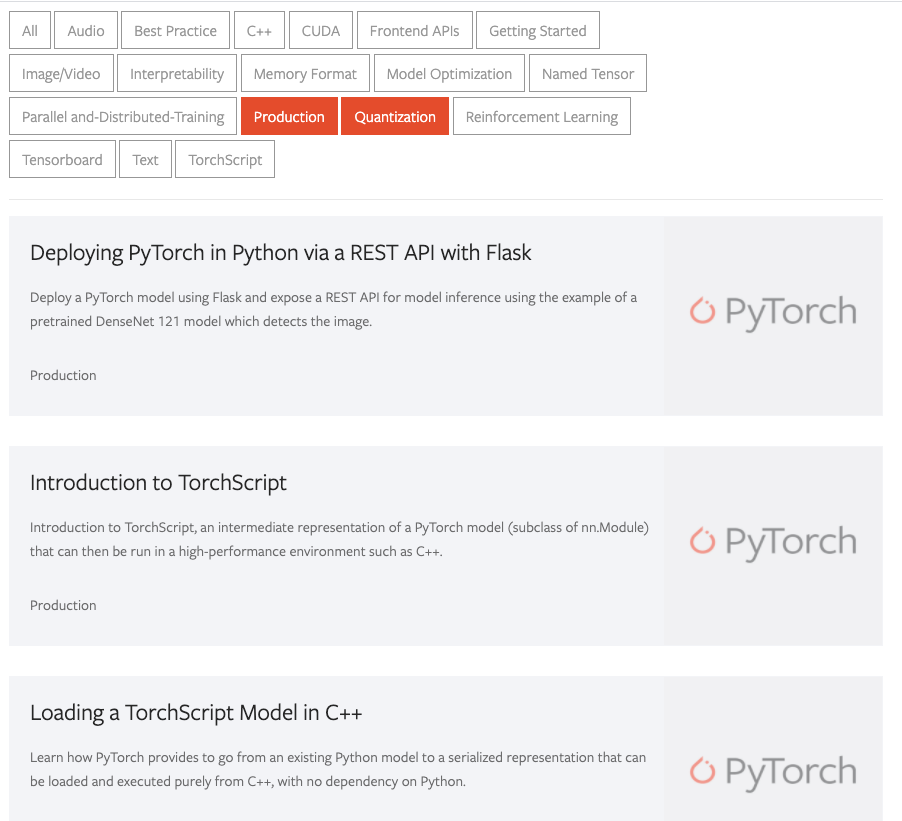 In addition to the existing left navigation bar, tutorials can now be quickly filtered by multi-select tags. Let’s say you want to view all tutorials related to “Production” and “Quantization”. You can select the “Production” and “Quantization” filters as shown in the image shown below: