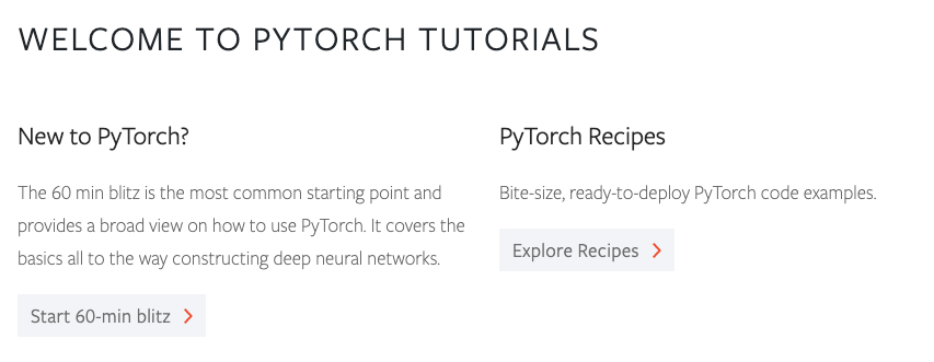 The tutorials home page now provides clear actions that developers can take. For new PyTorch users, there is an easy-to-discover button to take them directly to “A 60 Minute Blitz”. Right next to it, there is a button to view all recipes which are designed to teach specific features quickly with examples.